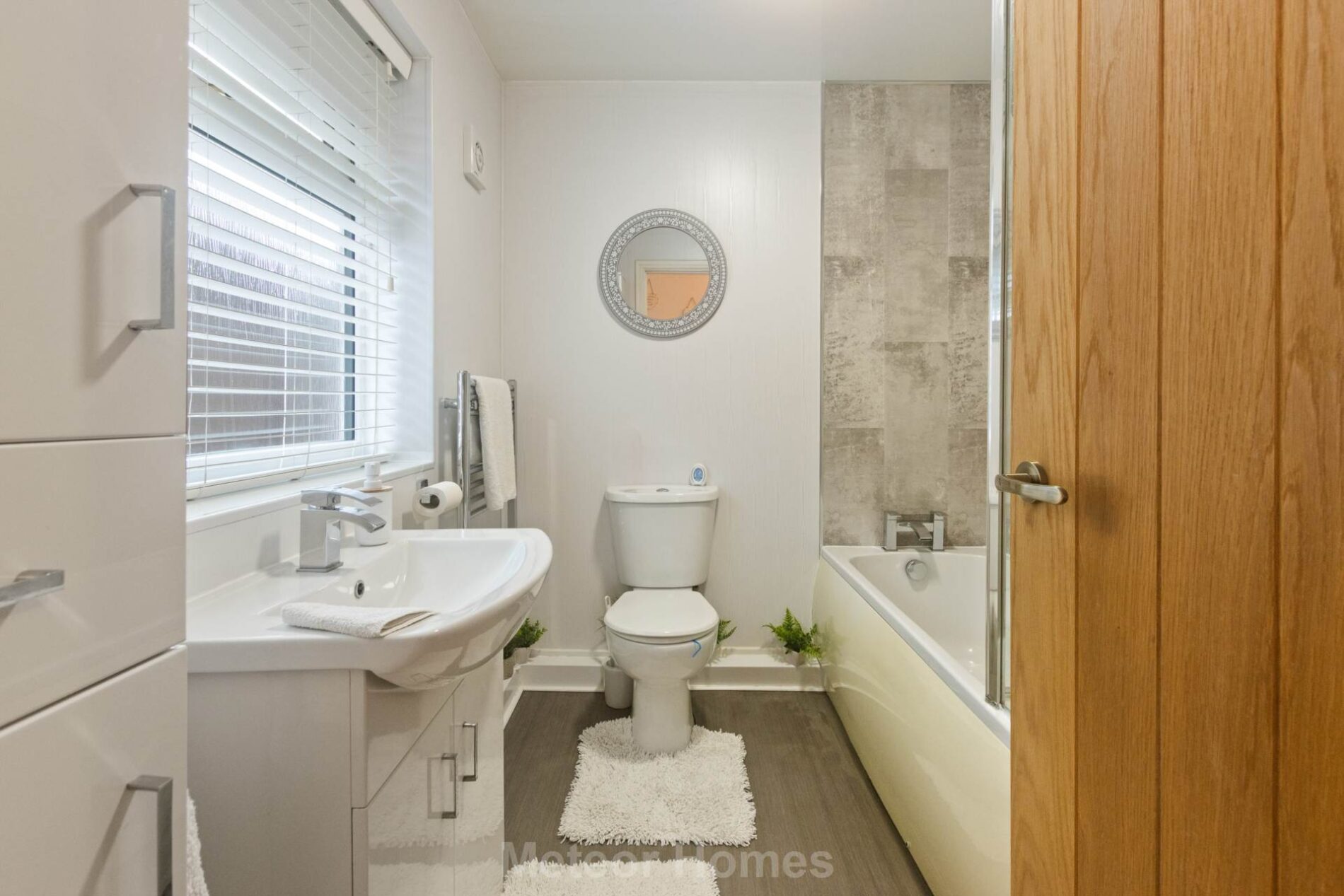 With white suite comprising handbasin, WC and panelled bath with shower over. There is also a heated towel rail and uPVC double glazed window.