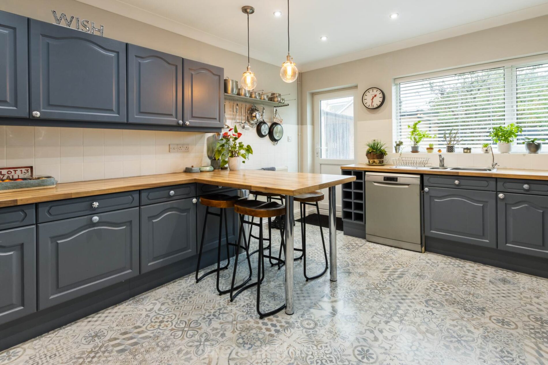 A superbly appointed fitted Kitchen with a large range of grey shaker style units, roll edge worktops and matching breakfast bar. There is a built in electric oven and hob. plumbing for dishwasher, uPVC double glazed window and door.