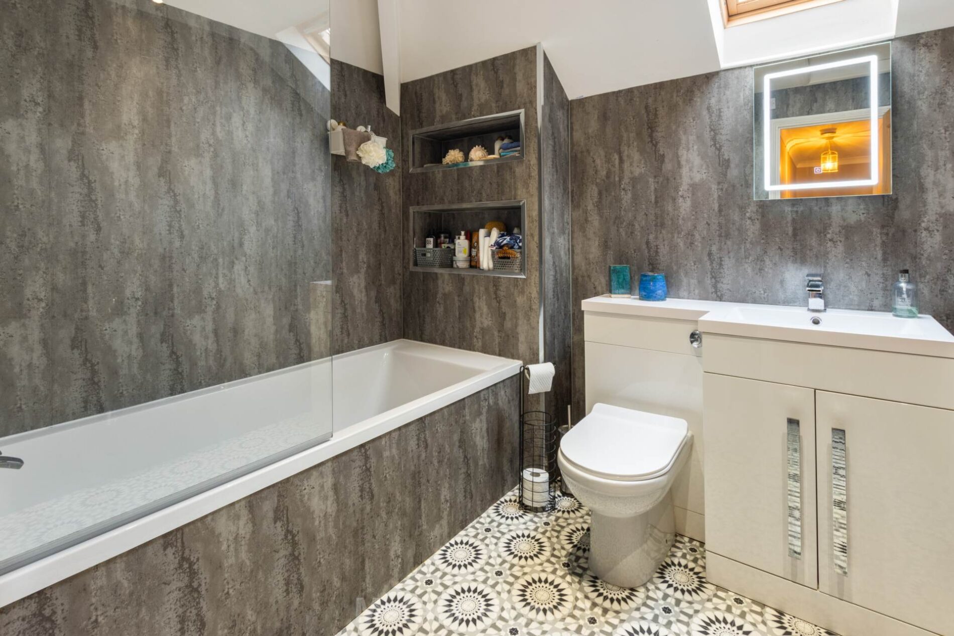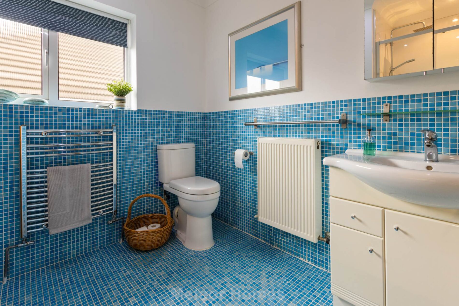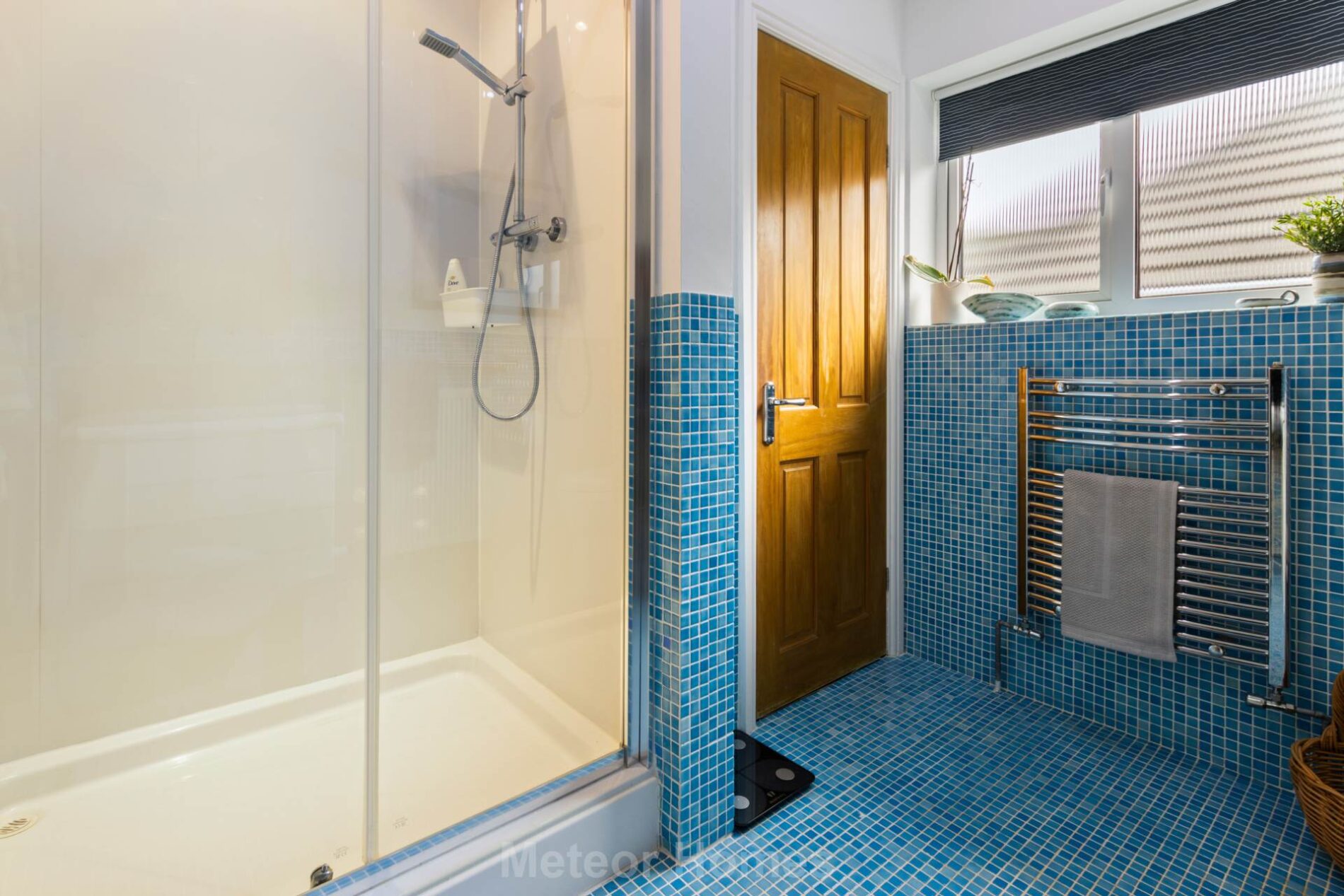 With double width walk in shower cubicle, uPVC double glazed window, heated towel rail, mosaic tiled floor and half tiled walls, radiator, WC, washbasin and built in cupboard.