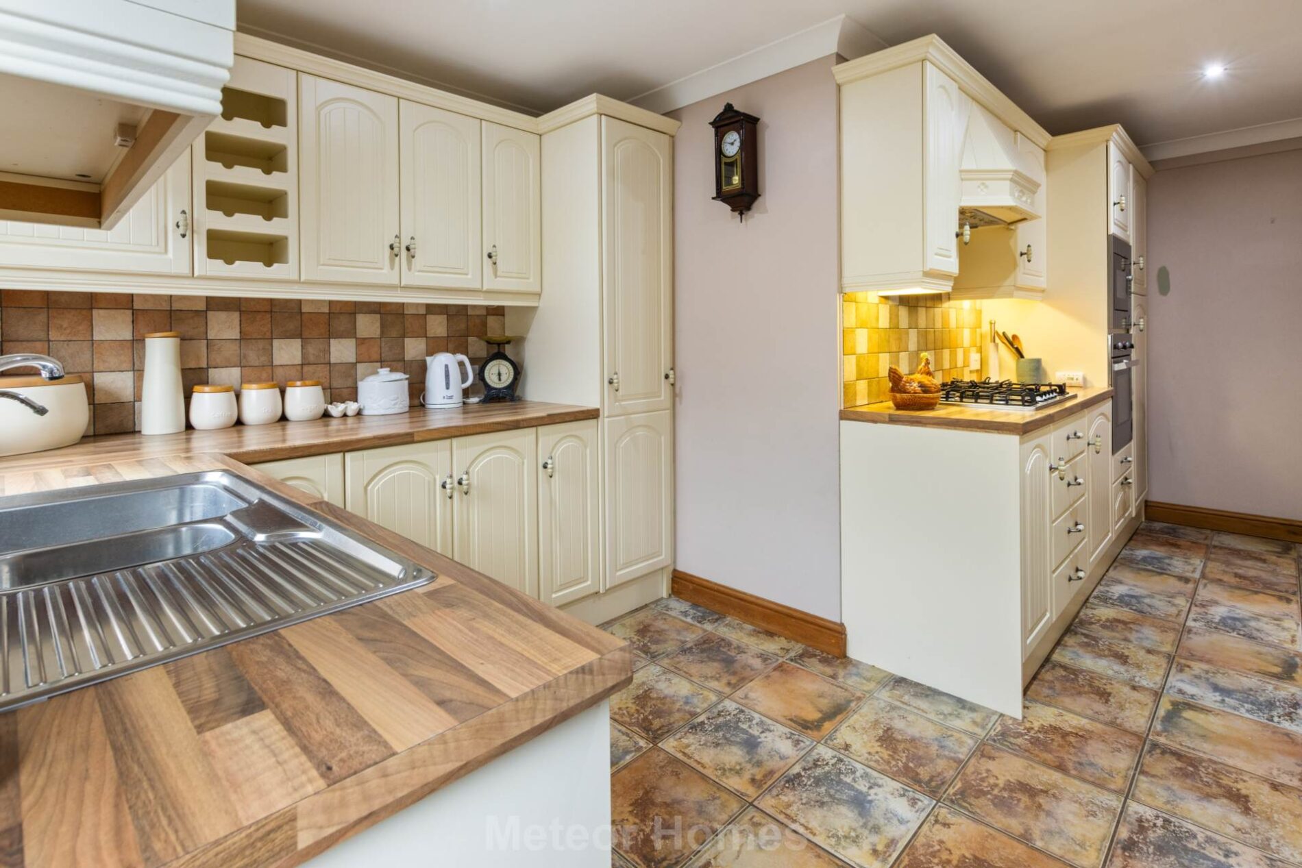 With uPVC double glazed door and window, range of cream shaker style units with integrated fridge freezer, built in oven, gas hob and microwave.