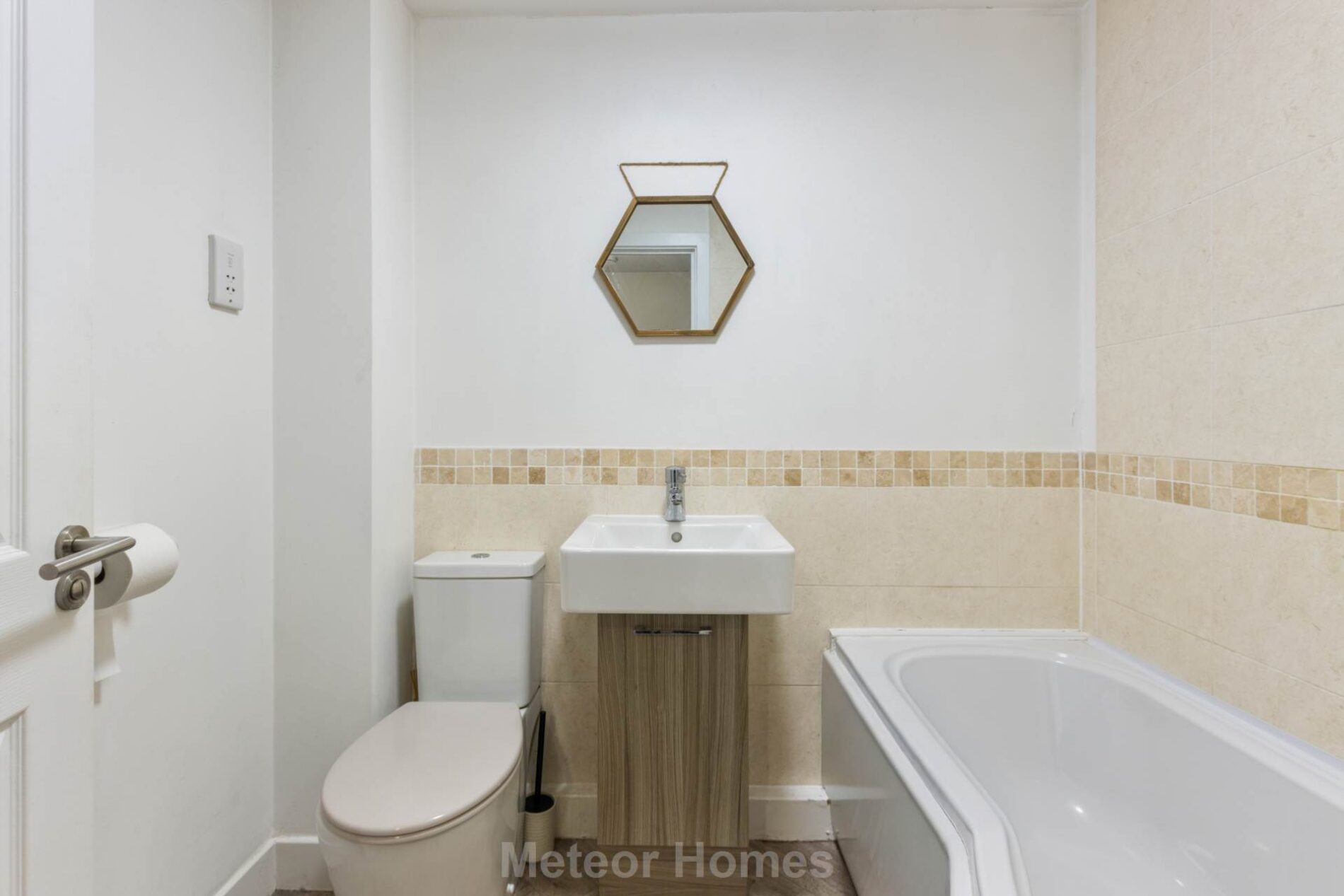 With white suite that comprises of panelled bath with shower over, handbasin and WC. There is also a heated towel rail.