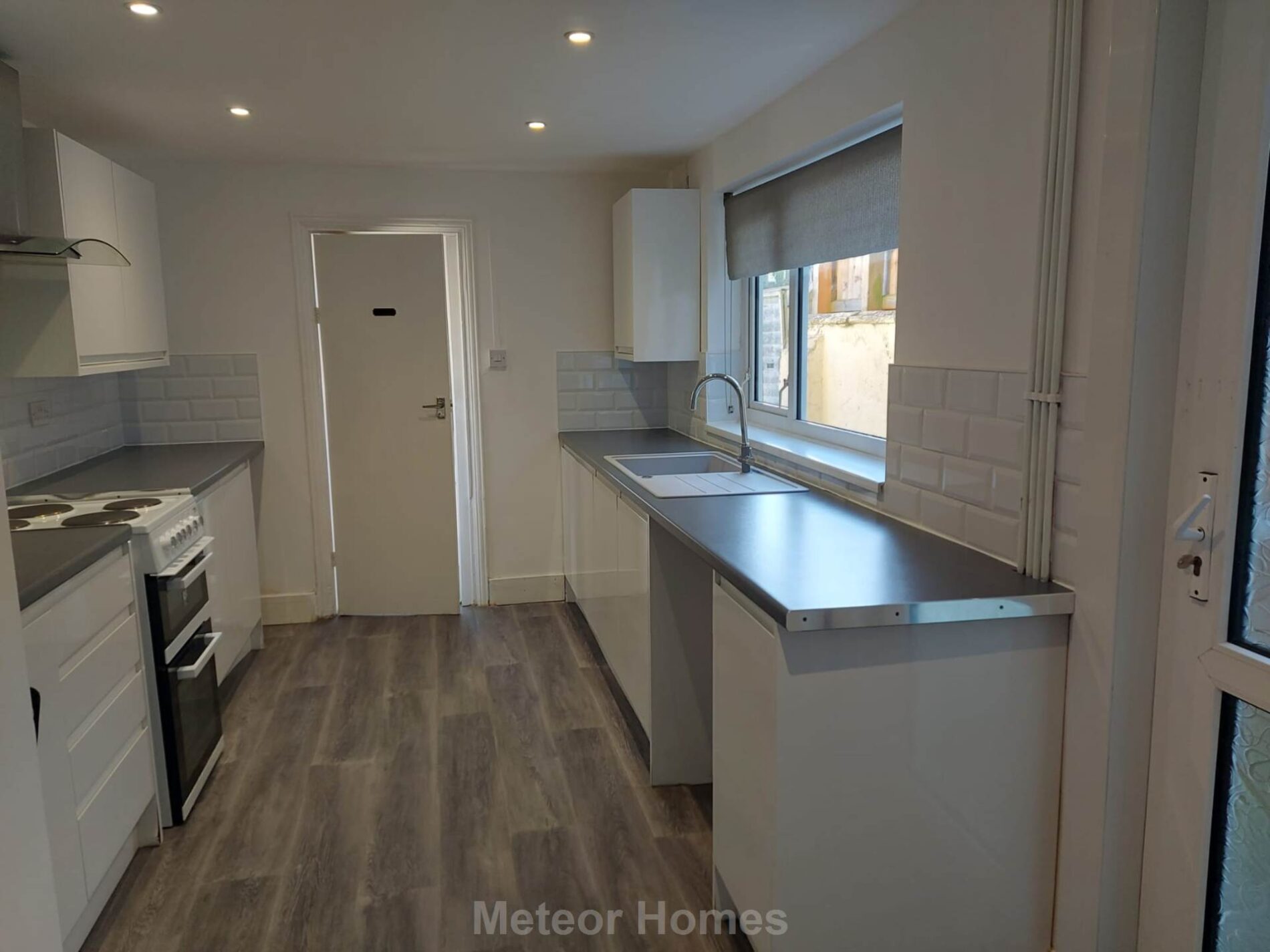 With a range of modern white fronted gloss units, electric cooker point, plumbing for washing machine, uPVC double glazed door and window and radiator.