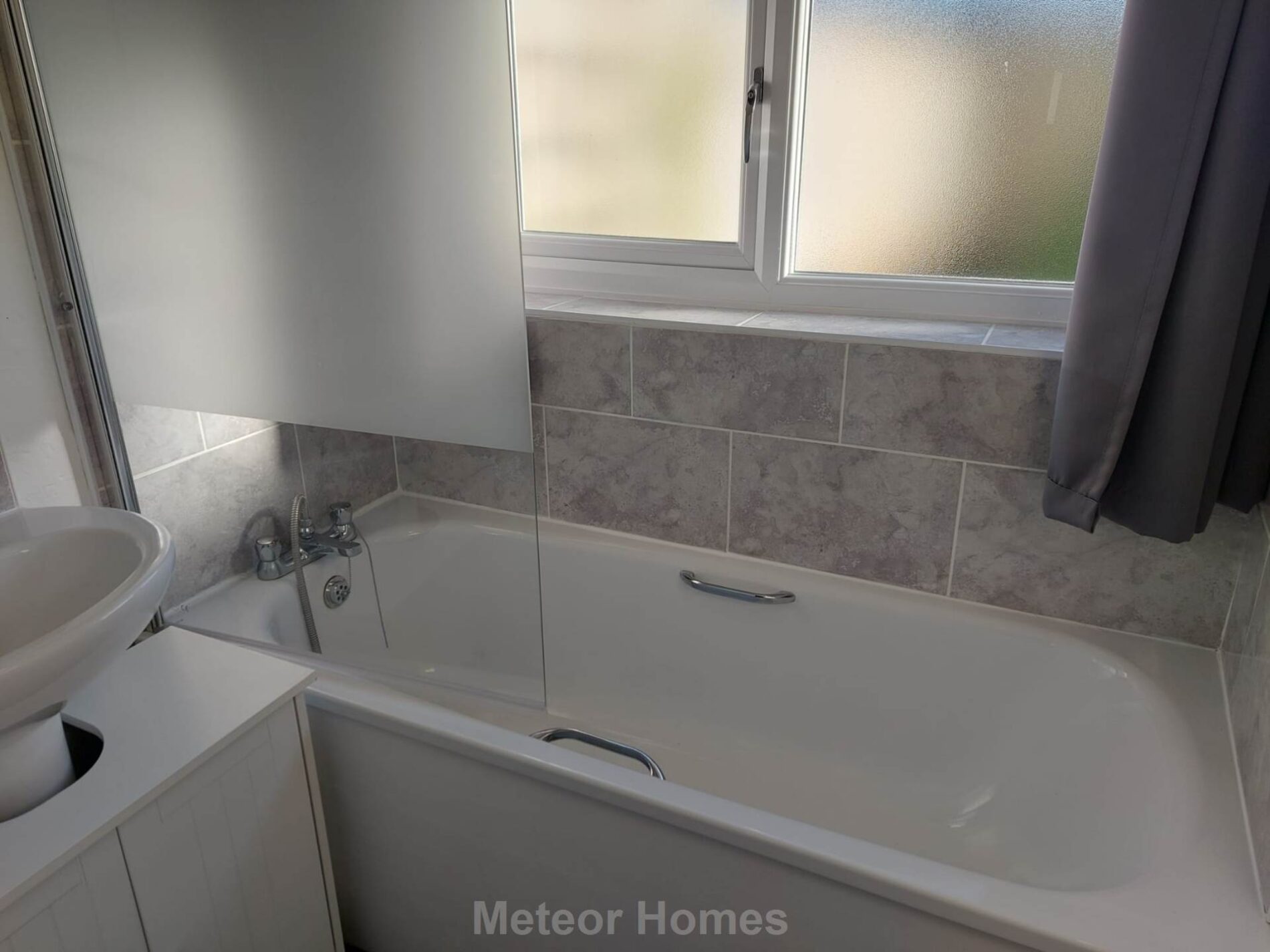 With white suite comprising WC, washbasin and panelled bath. There are also 2 uPVC double glazed windows and a radiator.
