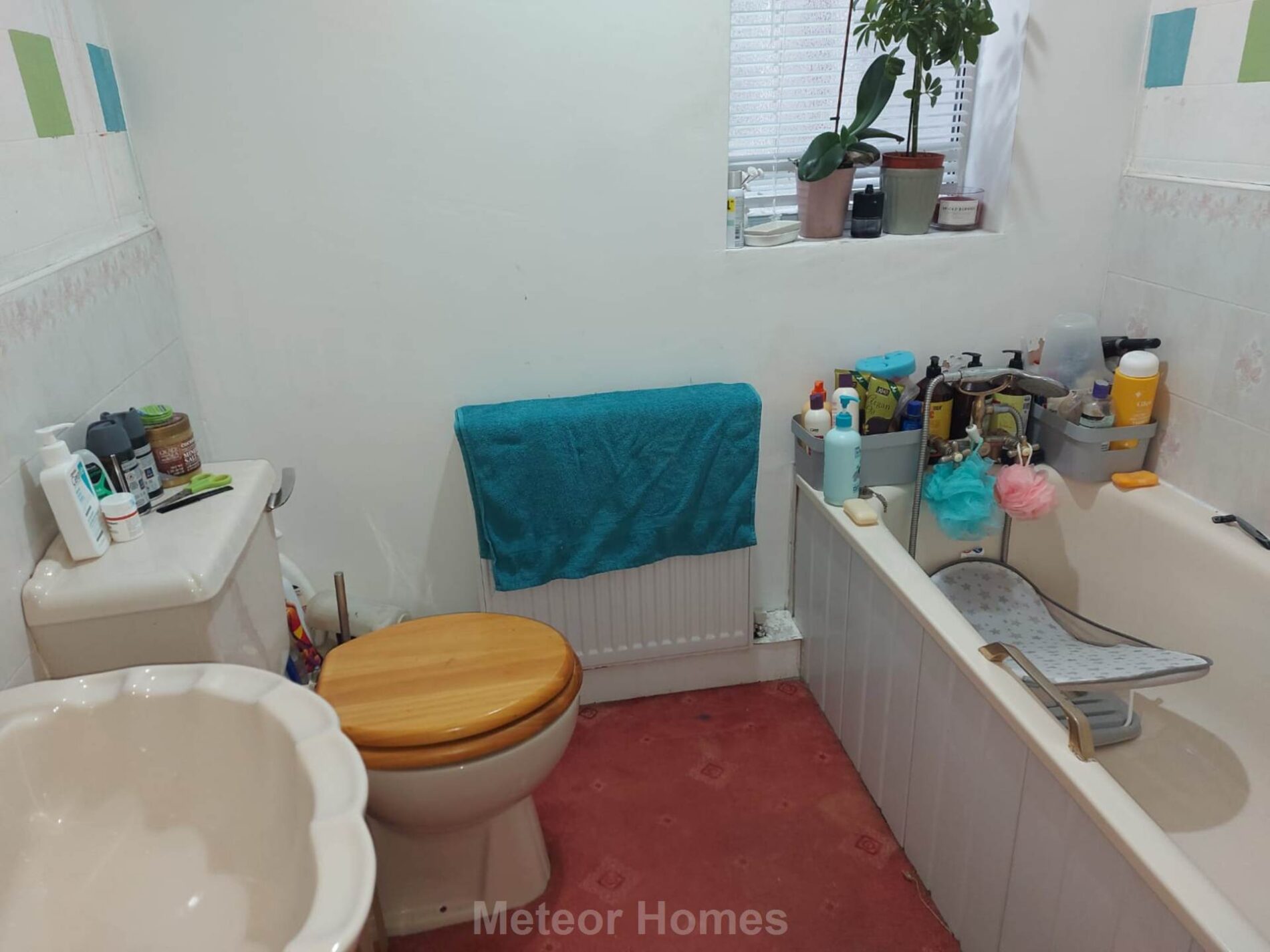 With coloured suite that comprises of handbasin, WC and panelled bath. There is also a uPVC double glazed window and radiator.
