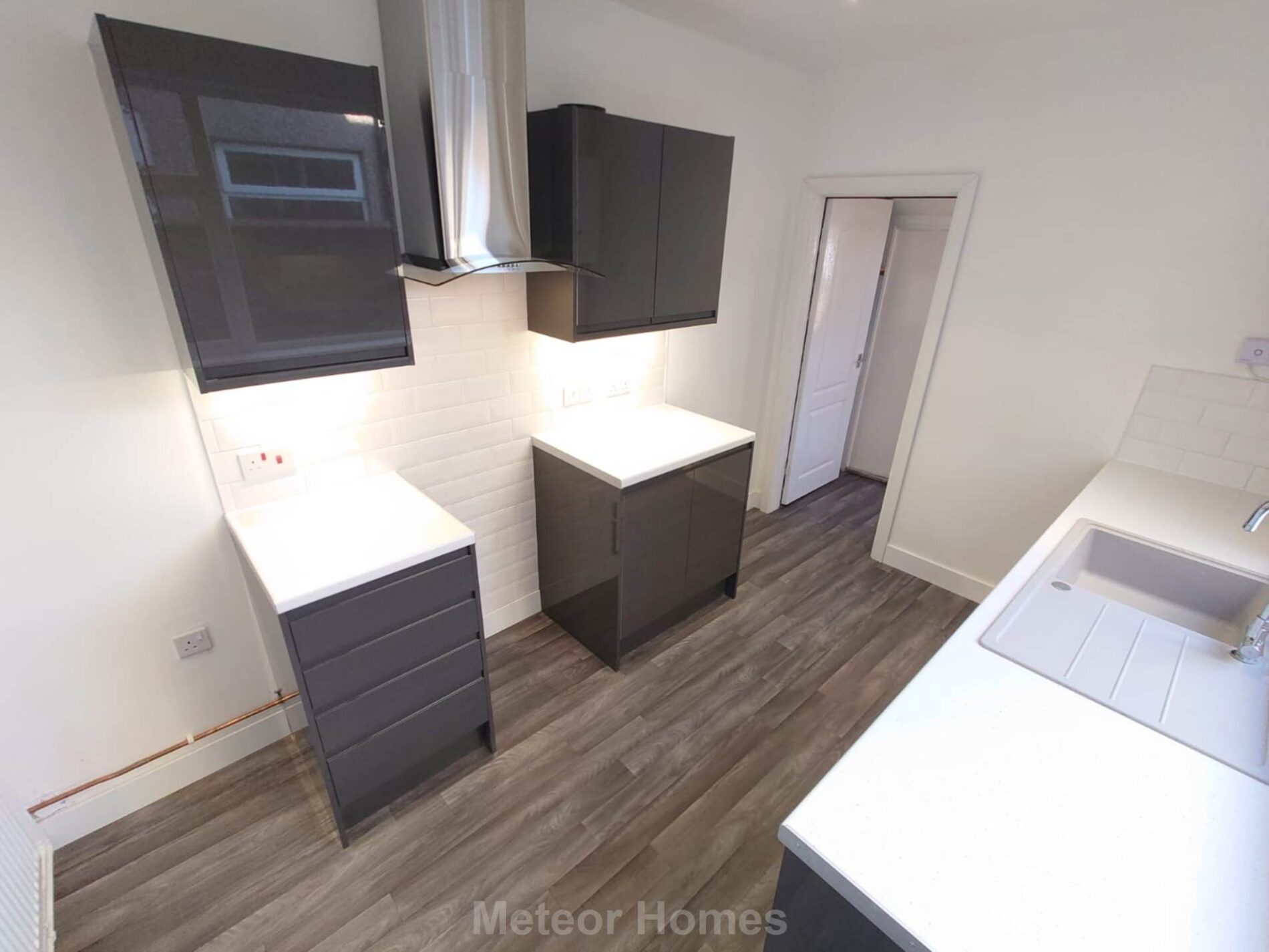 With modern grey gloss fronted fitted units, plumbing for washing machine, uPVC double glazed window to side, sink unit and Ideal combination boiler.