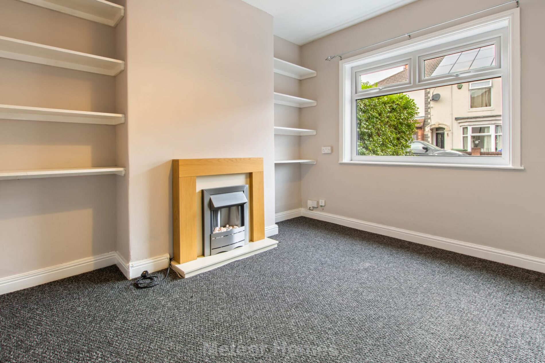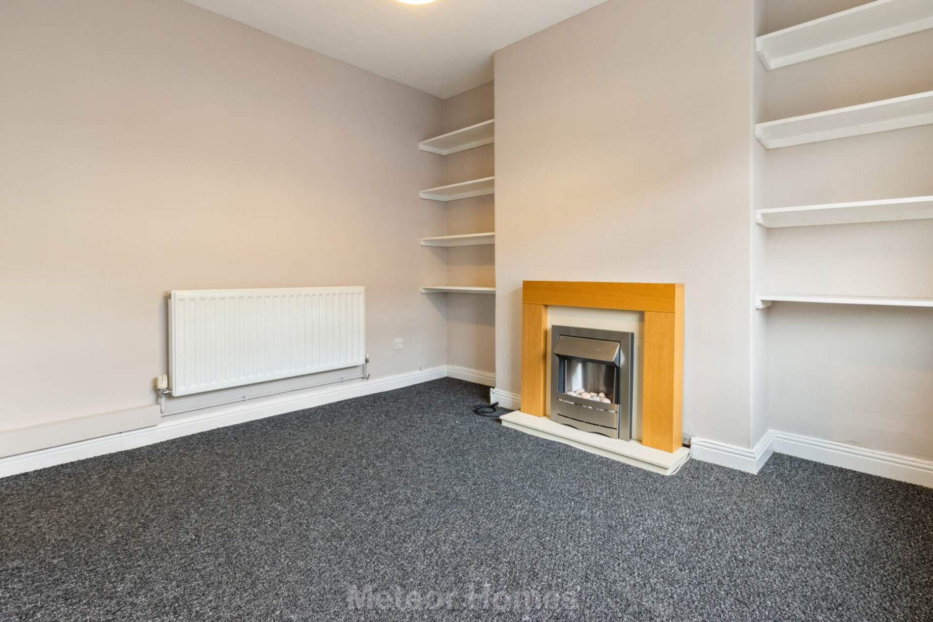 With uPVC double glazed window, gas fire within contemporary surround, radiator and shelving to chimney breast recess.