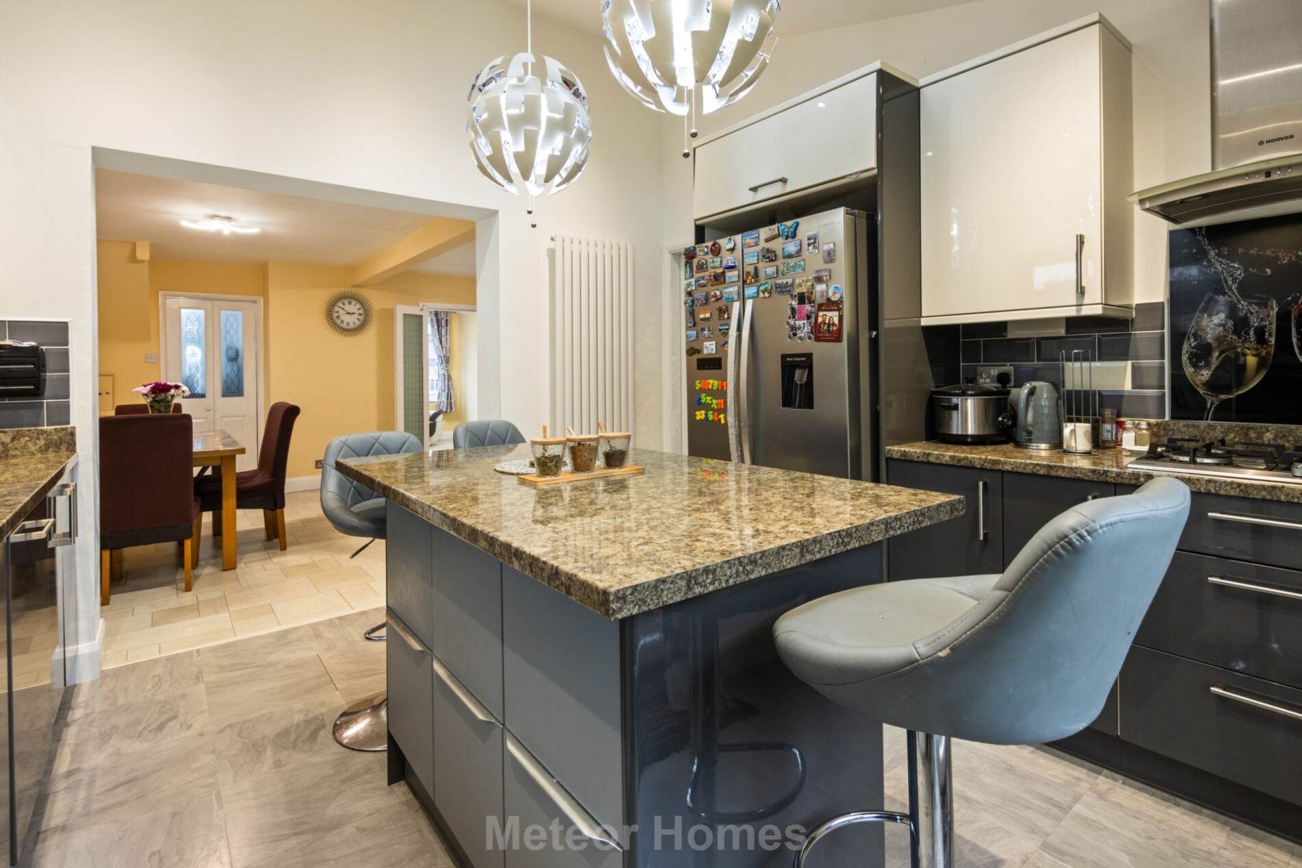 A stunning modern fitted kitchen with contrasting grey and cream gloss fronted units, central island, 2 velux windows to rear, uPVC double glazed pation doors to the rear and window to side, feature panel radiator, electric oven and gas hob.