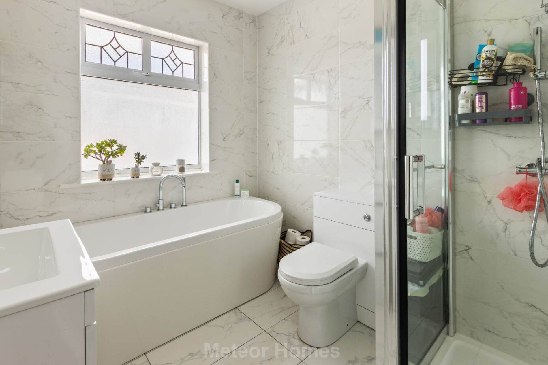 A superb modern bathroom with walk in shower cubicle, large bath tub with shower attachment, WC and washbasin. There is also a heated towel rail, tiled floor and walls.