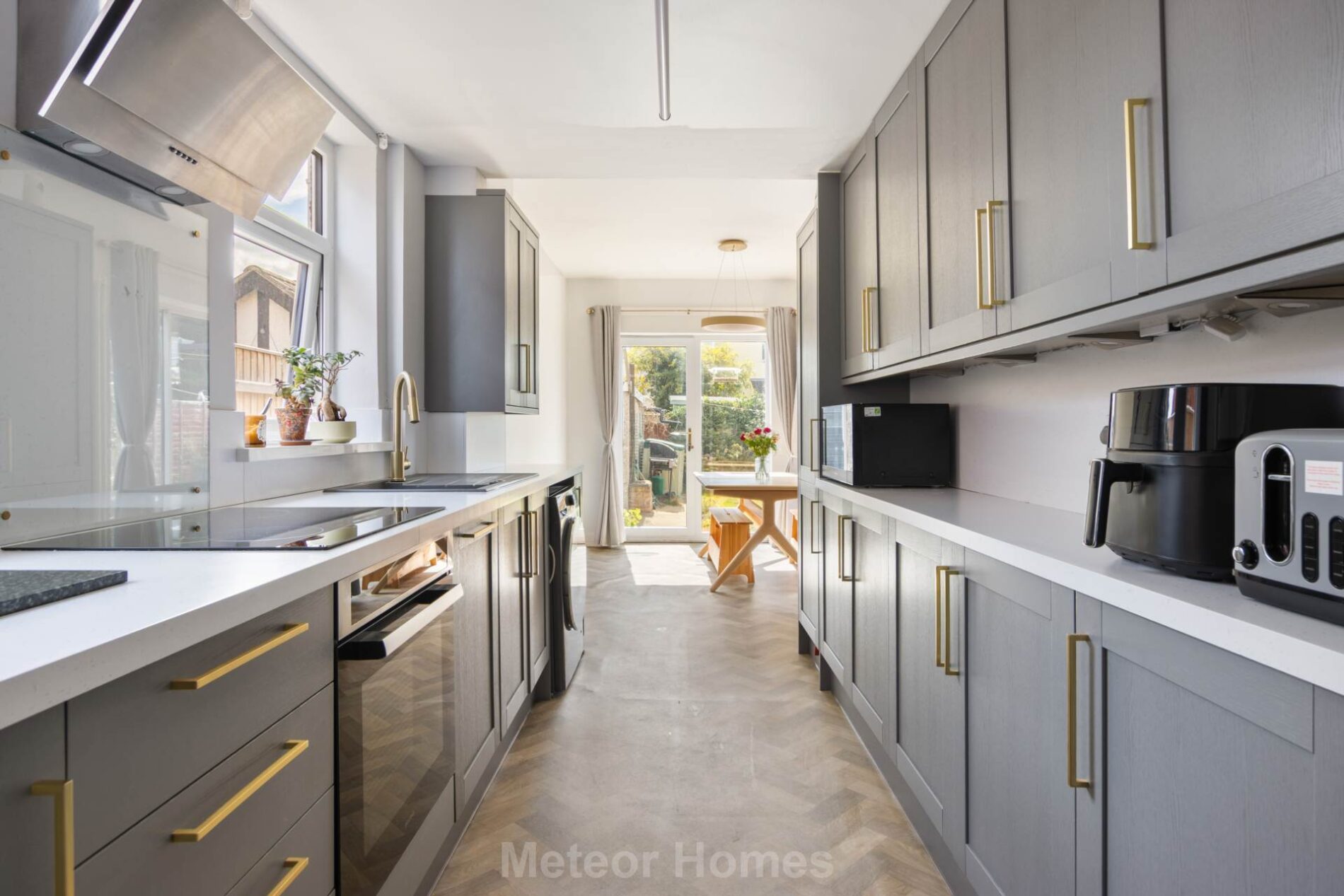 A tri-aspect Kitchen with uPVC double glazed window to side and door to rear and double glazed patio doors opening onto patio. The Kitchen itself is fitted with a range of modern shaker style units with integrated fridge freezer, built in oven with induction hob over and feature panel radiator.