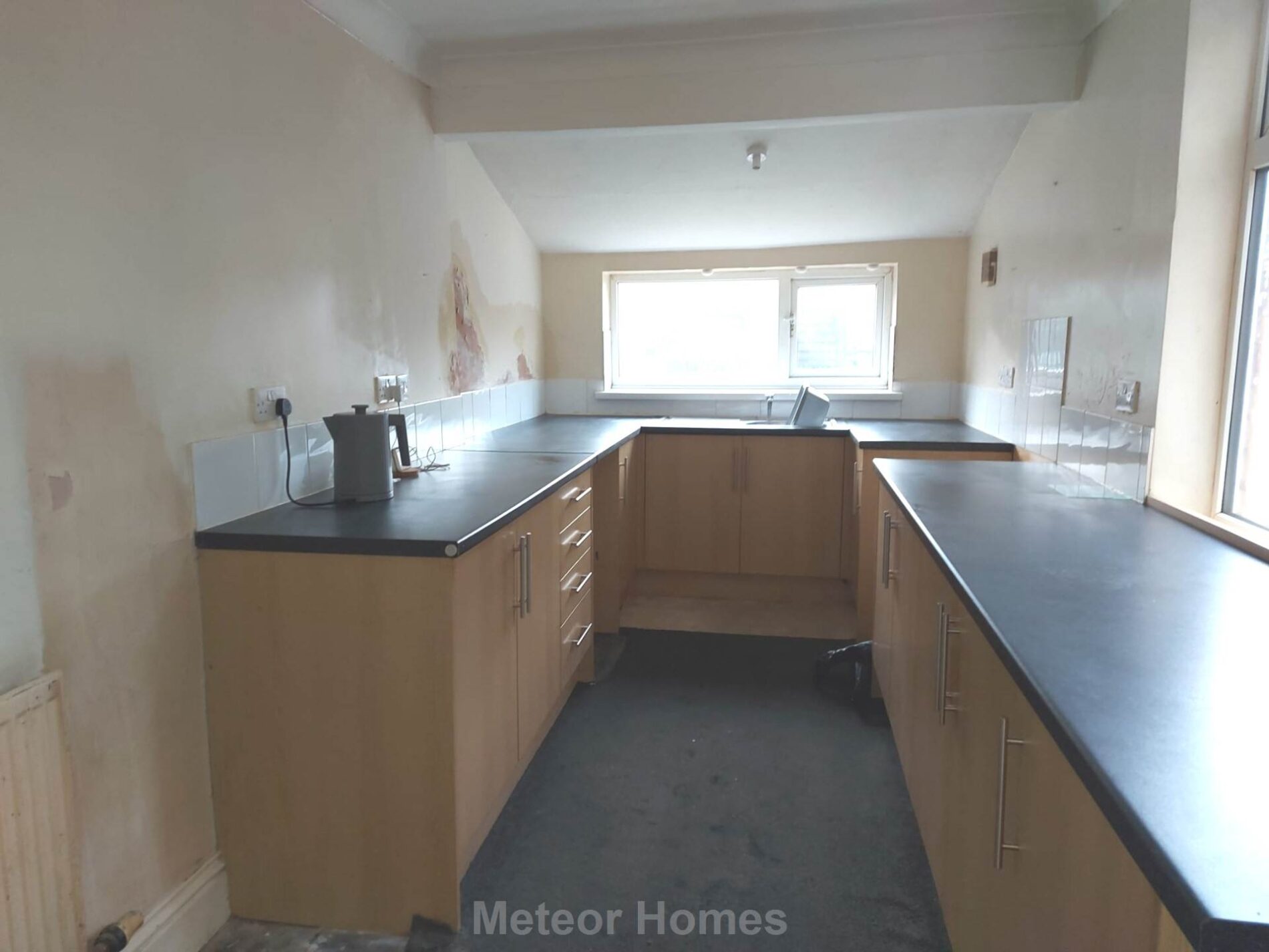 With a large range of beech effect fitted units with black roll edge worktops, plumbing for washing machine, radiator, uPVC double glazed door and windows to side and rear.