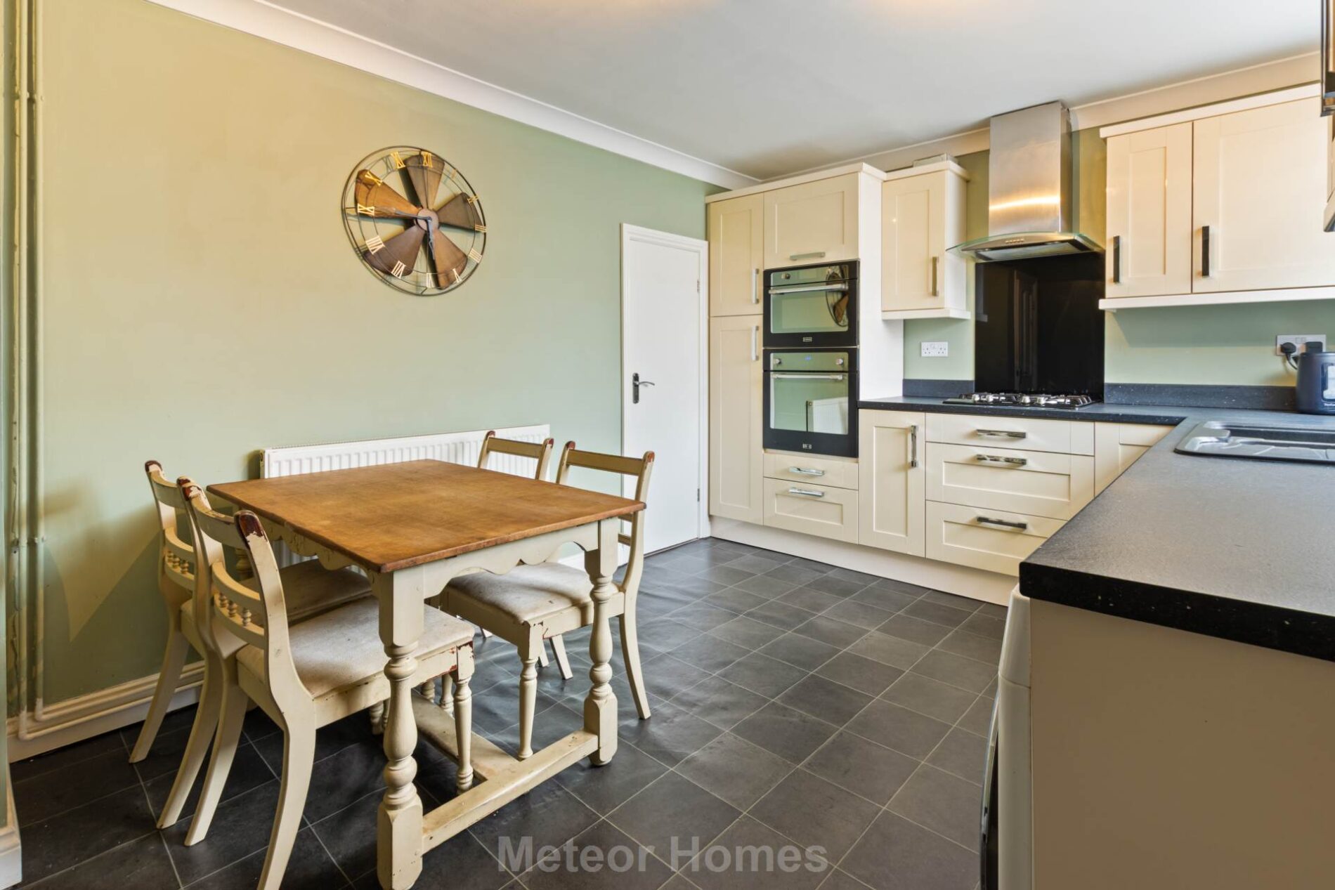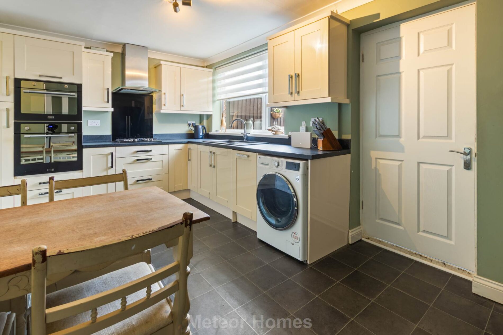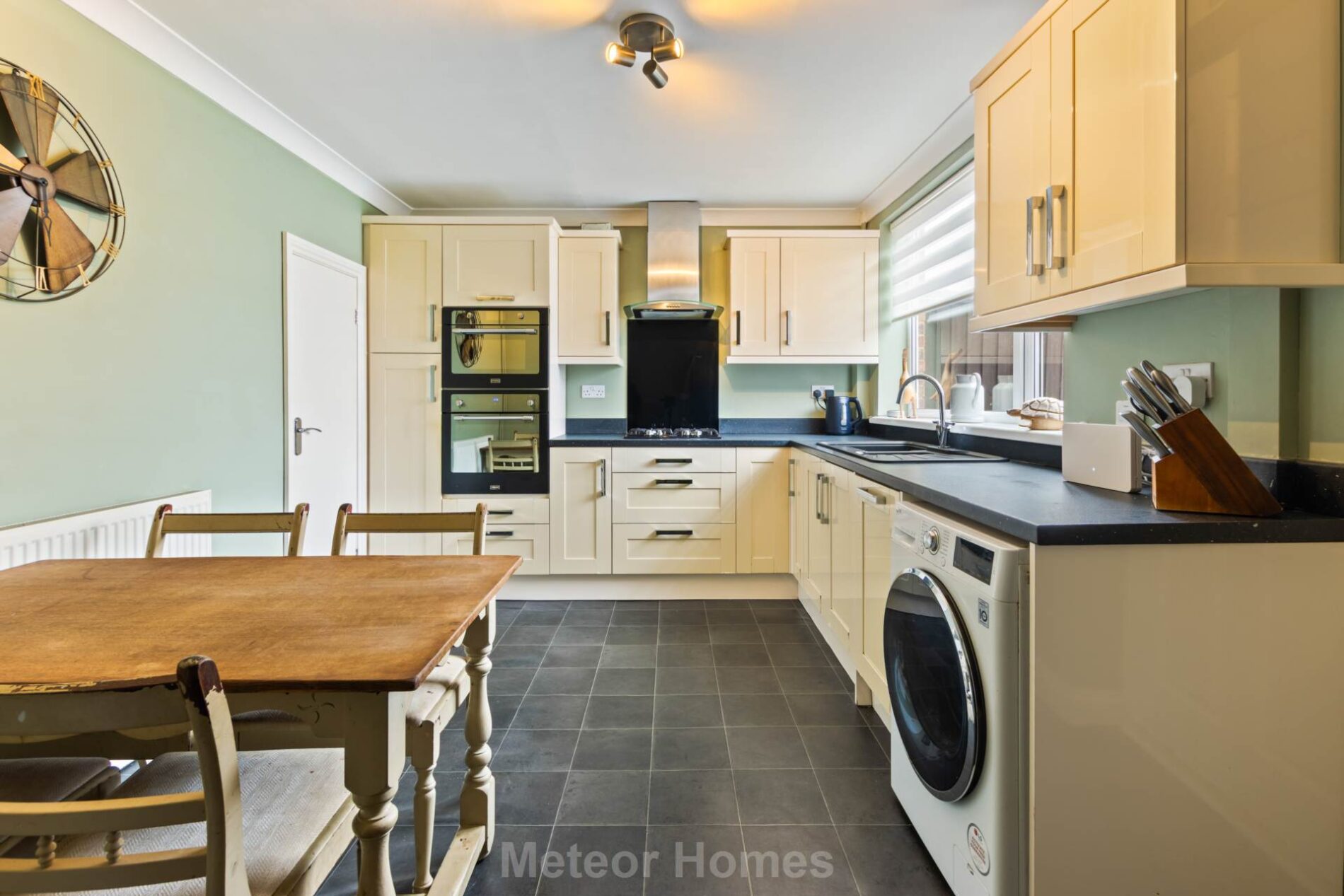 With space for a dining table, a large range of cream shaker style units, built in electric oven, microwave and gas hob. Plumbing for washing machine, radiator, uPVC double glazed window and walk in pantry cupboard.