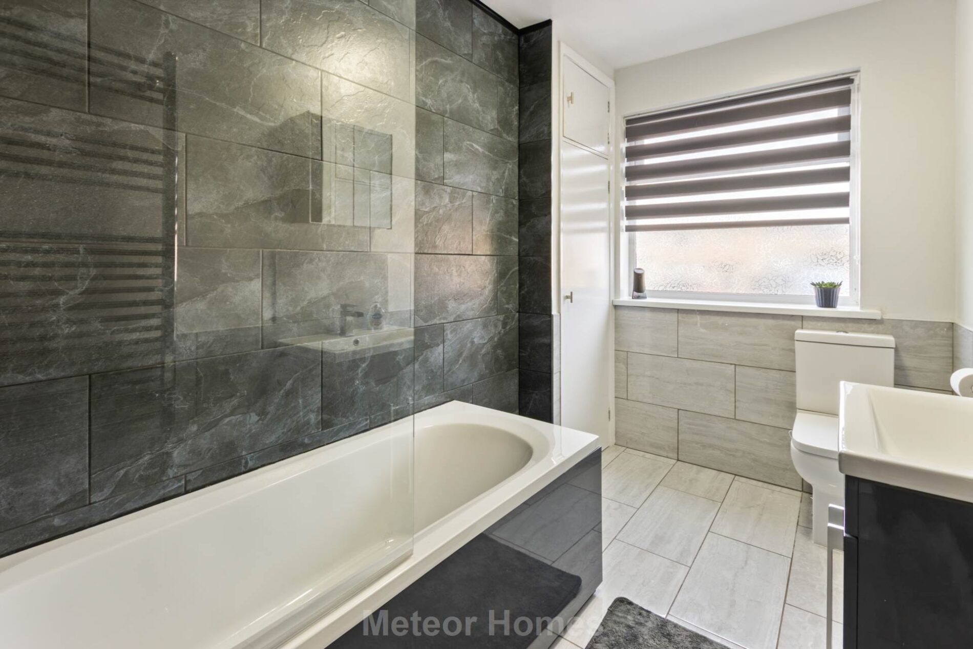 A stunning modern bathroom with white suite that boasts vanity washbasin, WC and panelled bath with shower over. The room also consists of an airing cupboard, heated towel rail and uPVC double glazed window.