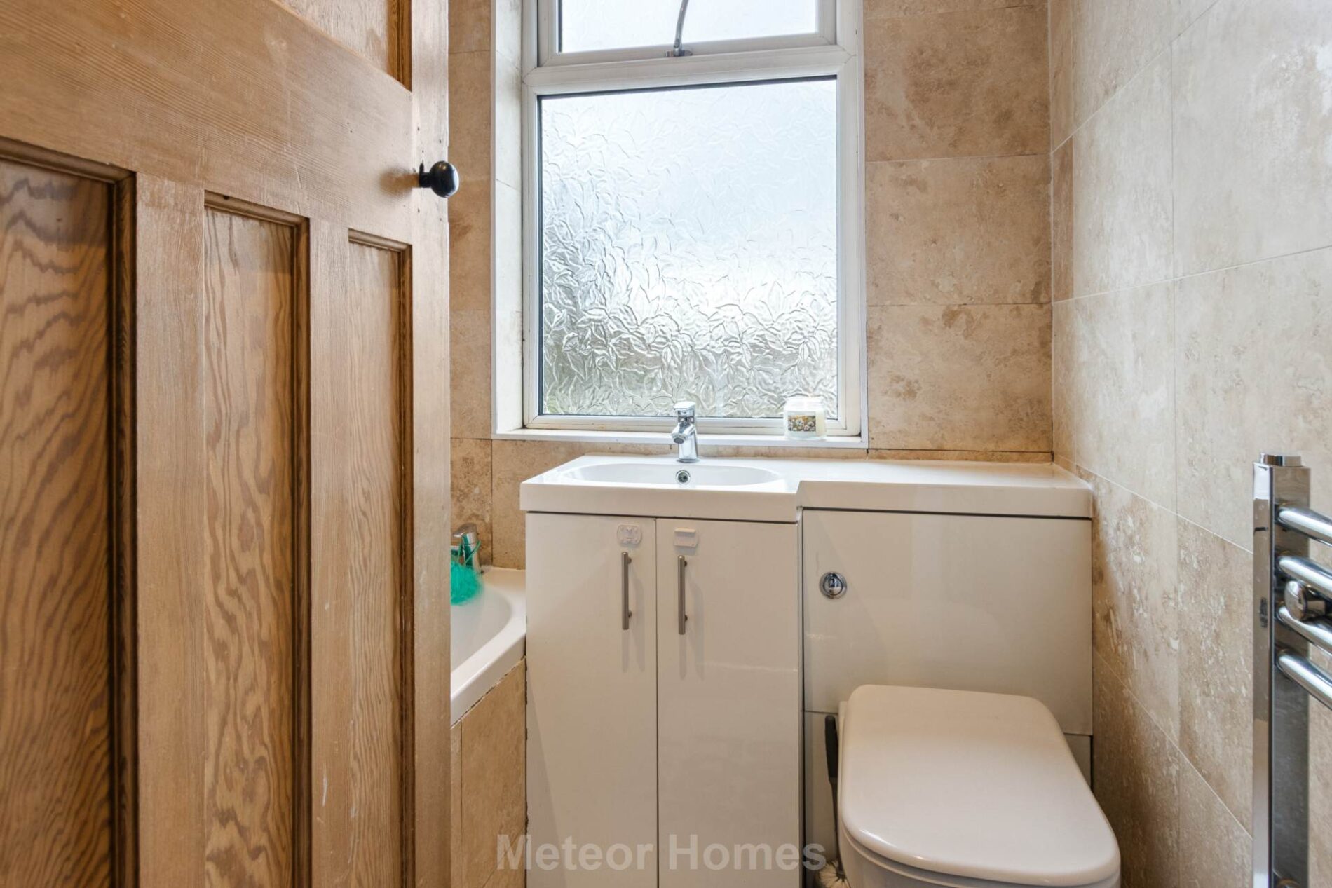 With white bathroom suite that comprises washbasin, WC and panelled bath with shower over. There are also tiled walls, radiator and uPVC double glazed window.
